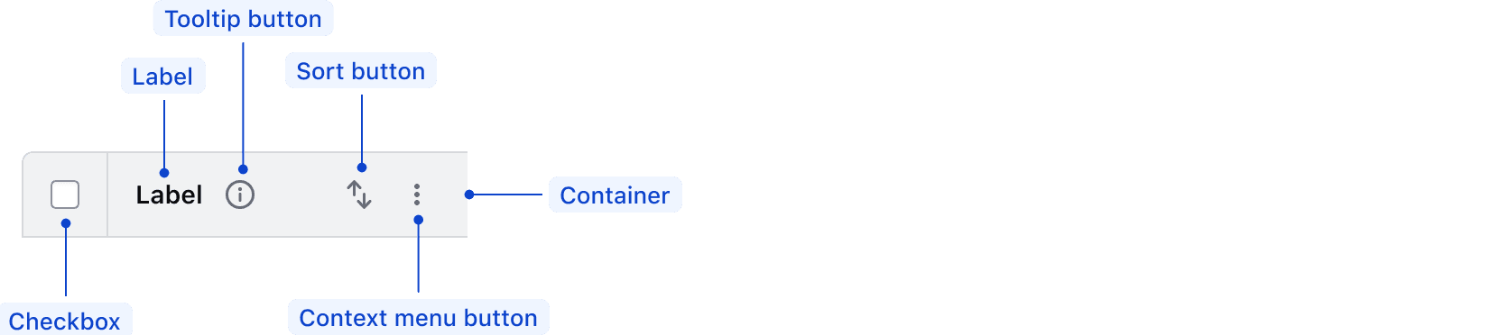 - The label should clearly indicate what type of content is contained within the cell (string, number, status, etc).